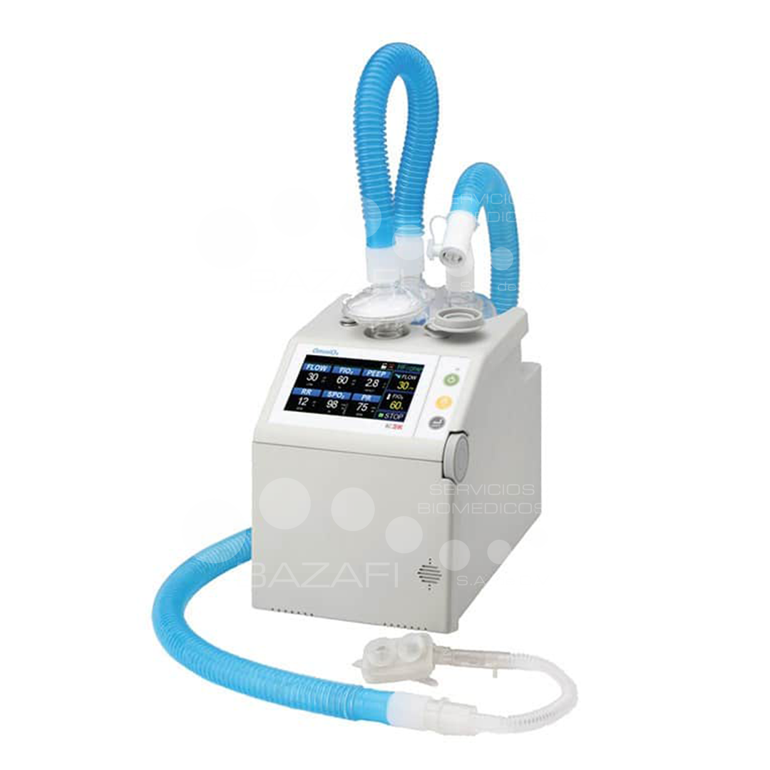Dispositivo médico que brinda soporte respiratorio al paciente mediante la mezcla de aire-oxígeno humidificado, a través de métodos de ventilación no invasiva (HF, CPAP, ST).